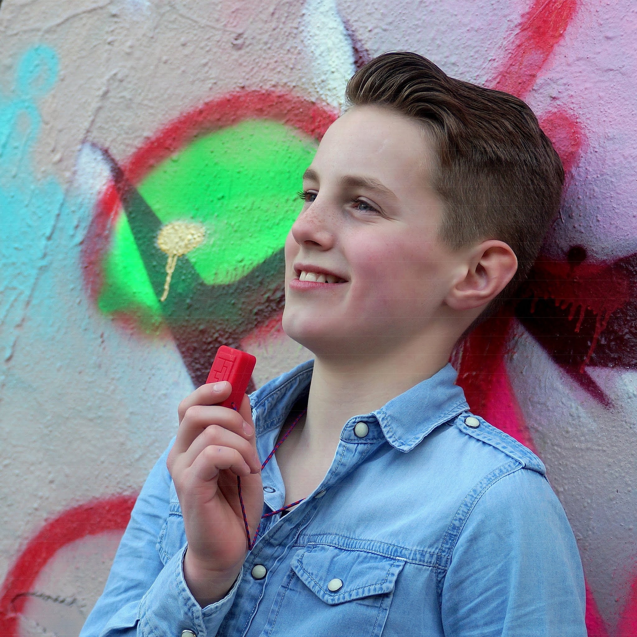 Žuvacia pomôcka Chewigem Geotag je v tvare identifikačného štítku so vzorom ,,tetris" a má podobu prívesku.