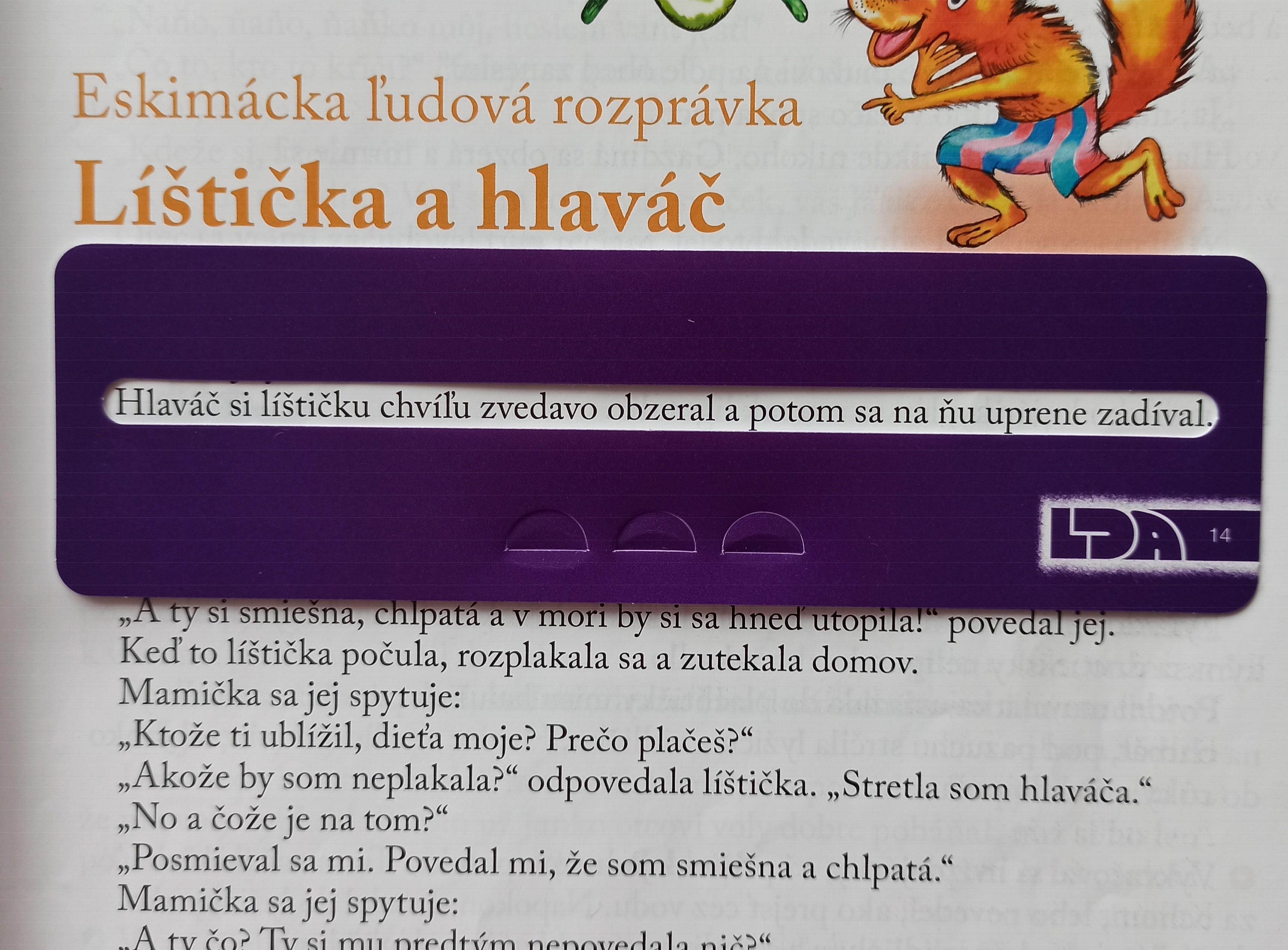 Čítacie okienko s výrezom v strede v dĺžke jedného riadku – pomáha lepšie fixovať zrak dieťaťa na konkrétny riadok pri čítaní. Okolitý text je zakrytý, čo zabraňuje preskakovaniu medzi riadkami a zlepšuje sa sústredenosť pri čítaní.