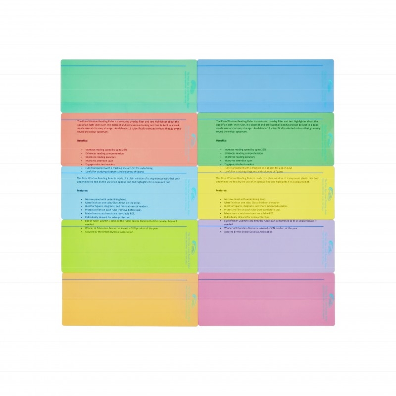 Fólia s farebným filtrom vo formáte DL v podobe ukazovátka. Špeciálne ukazovátko na zvládanie vizuálneho stresu. Prikladajú sa na čítaný text. Ukazovátko má tenkú vodiacu linku pre vedenie očí po čítanom riadku. Širšia časť ukazovátka sa dá použiť na zvýraznenie väčšieho odseku. Ukazovátko je diskrétne a môže sa uložiť v knihe ako záložka.