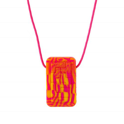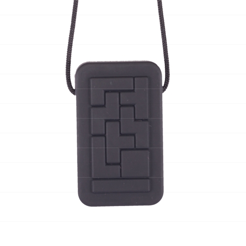 Žuvacia pomôcka Chewigem Geotag je v tvare identifikačného štítku so vzorom ,,tetris" a má podobu prívesku.